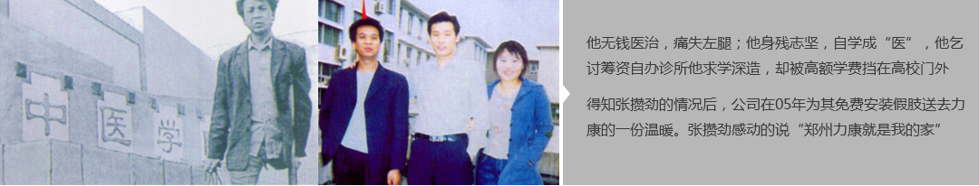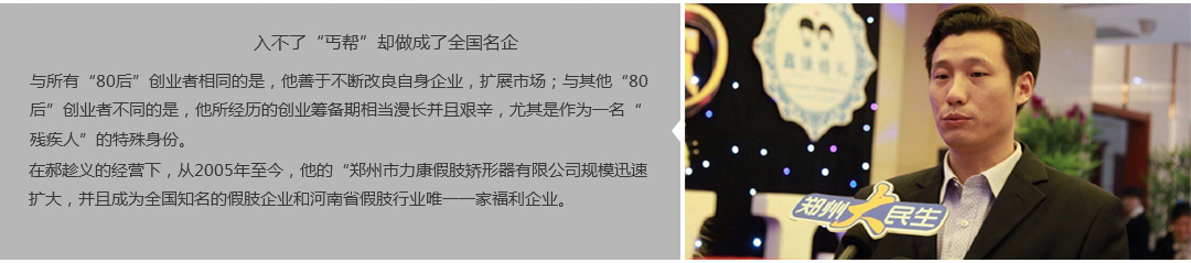 鄭州市力康假肢矯形器有限公司(簡(jiǎn)稱力康),是一家專業(yè)從事假肢矯形器的設(shè)計(jì)、研發(fā)、制作及裝 配的專業(yè)機(jī)構(gòu)。成立于1992年是河南省唯一一家福利企業(yè)。力康下設(shè)業(yè)務(wù)部、技術(shù)部、住院部、康復(fù) 部、售后服務(wù)部,并配有現(xiàn)代化的裝配車間和功能齊全的訓(xùn)練大廳,為殘疾朋友康復(fù)訓(xùn)練提供了可靠 保障。總經(jīng)理穿戴假肢多年,有著豐富的臨床經(jīng)驗(yàn)和親身體會(huì);多年來,力康已為全國(guó)幾十萬名殘疾 朋友安裝上舒適、美觀、耐用的假肢和矯形器具,使他們更大限度地恢復(fù)了正常的工作和生活。“產(chǎn) 品即人品”的質(zhì)量理念、先進(jìn)的技術(shù)、實(shí)惠的價(jià)格、完善的售后服務(wù)是力康取勝的法寶……